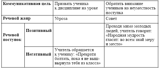 Как видим, учитель своей «речевой волей» в соответствии с замыслом и ситуацией общения, со своими нравственными установками обращается к такому речевому жанру, который предопределяет качество его речевого поступка, его нравственную основу и характеризует общую культуру педагога.