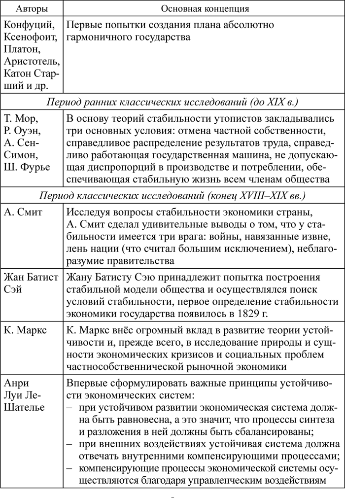 Понятие «устойчивости» в литературных изданиях рассматривается в различных аспектах. С точки зрения социально-экономической в научных кругах XIX и XX веков учёные-экономисты, социологи и различные политические деятели проблемы устойчивости (неустойчивости), определённости (неопределённости), стабильности (нестабильности) обосновывали с разных позиций: основоположники марксистского учения К. Маркс и Ф. Энгельс считали, что из-за противоречий между производительными силами и производственными отношениями в капиталистическом обществе определяются хаос и нестабильности и поэтому они обосновывали борьбу классов как движущую силу истории [8. С. 643]; социологи Э. Дюркгейм, Р. Мертон, Т. Парсонс, И. Сакс считали, что скачкообразность процессов устойчивости и стабильности на пред – приятиях и в обществе в целом является закономерным процессом перехода от низшей стадии развития к высшей и зависит от множества факторов; теорию экономического равновесия развили учёные: Л. Вальрас, Дж. Кейнс, Ф. Кенэ, В. Леонтьев, А. Маршалл, П. Самуэльсон, А. Смит и другие, которые описывали статику и динамику рыночных отношений.