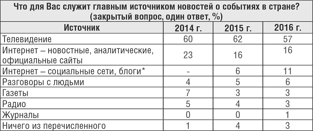 Несмотря на то что доля активных пользователей, выходящих в Интернет хотя бы раз в сутки, составляет 57 %[6], телевидение по-прежнему остается лидером по среднесуточному охвату аудитории, который в 2014 г. составлял 72 % населения (аудитория «Все 4», TNS[7]). При этом объем телесмотрения постоянно растет: в 2014 г. среднесуточная продолжительность просмотра телевидения выросла на пять минут по сравнению с 2013 г. и составила 4 ч. 04 мин. (аудитория старше 4 лет). Взрослое население в 2014 г. стало смотреть телевизор на шесть минут больше (4 ч. 20 мин.). Как отмечают специалисты Аналитического центра Vi[8], «это самые высокие показатели телесмотрения за всю историю электронных измерений в России (с 1999 г.)» (Вартанова, Коломиец (ред.), 2016: 77). К тому же подавляющая часть россиян, по данным ВЦИОМ[9] на весну 2016 г., узнает новости именно из телепрограмм. Телевидение служит основным источником актуальной информации для 57 % жителей страны (см. Табл. 6). Несмотря на разнонаправленную динамику, есть основания полагать, что сложившаяся тенденция останется актуальной в ближайшие годы.