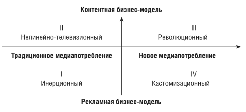IV. «Кастомизационный». Сценарий предполагает распространение новой модели медиапотребления при сохранении рекламной модели. Особенности такого развития: