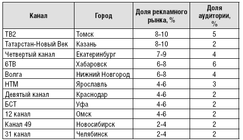 Если же обращаться к тем рынкам, по которым нет официальной статистики, оценки самих телеканалов и экспертов выглядят достаточно высокими. В средних городах, таких как Пенза или Киров, доля полновещательного канала может выходить за пределы 10 % и подходить к 15 % телерекламного рынка.