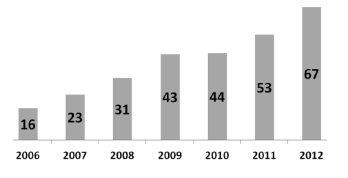Данные АЦВИ на 2012 год примерно соответствуют вышеприведенной статистике (см. диаграмму 2). Так, в 2012 г., по данным исследования городского населения России, более половины (67 %) домохозяйств принимали телесигнал неэфирным способом. При этом впечатляет динамика: в 2006 г., по подсчетам АЦВИ, таких было всего 16 %[15].