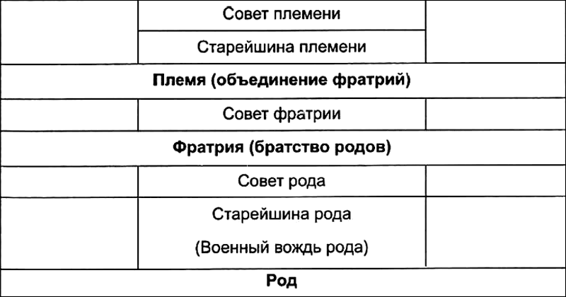 По трудам археологов, антропологов и ученых-исследователей других наук известно, что в период существования человечества на Земле до 5-го тыс. до н. э. действительно существовал большой этап, когда идеи и знания об управлении передавались от одного поколения к другому только в устной форме с целью повторения успешных действий, закрепления хороших традиций и положительного опыта управления хозяйствами первобытных общественных организаций. Начало этому процессу было положено в глубокой древности с появлением первых сообществ людей и их совместной деятельности, а также соответствующего примитивного управления. Идеи и знания управления отражали постепенно обогащающийся опыт управления хозяйством рода, хозяйством нескольких родов – братств (или фратрий), хозяйством племени, хозяйством союза племени, общины, где для выработки общих решений проводились собрания соплеменников и избирались сменяемые руководители-старейшины, а со временем в помощь им и другие выборные лица. Так было в ирокезском роде, где избирались старейшина для мирного времени и вождь – военный предводитель, создавался племенной совет из родовых сахемов и военачальников. Так было в греческом роде, где избирались старейшина – архонт, военачальник – басилей и казначей, формировался совет старейшин и собирались народные собрания. Так было в тысячах других родов, племен, племенных союзов. Таким образом, уже в эпоху материнской родовой общины были отработаны механизмы избрания руководителей и организационные структуры управления этих общин, отражавшие властные отношения, которые формировались в хозяйственной жизни в мирное и военное время (рис. 2.1).
