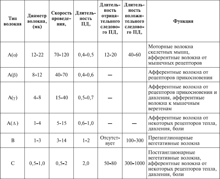 По скорости проведения импульса и строению нервные волокна разделяют на три группы – A, B и C. Волокна типа А делятся на 4 подгруппы: альфа-, бета-, гамма-, дельта-. Альфа-волокна имеют самый большой диаметр (12–22 мк) и обладают наибольшей скоростью проведения возбуждения (70–120 м/сек). Такие волокна проводят информацию к скелетным мышцам и от них в мозг, что позволяет человеку достаточно быстро приспосабливать положение своего тела к ситуации. Остальные нервные волокна имеют меньший диаметр (2–12 мк) и соответственно меньшую скорость проведения импульса. Они несут информацию от сенсорных органов. Гамма-волокна передают возбуждение от моторных нейронов спинного мозга к интрафузальным мышечным волокнам.