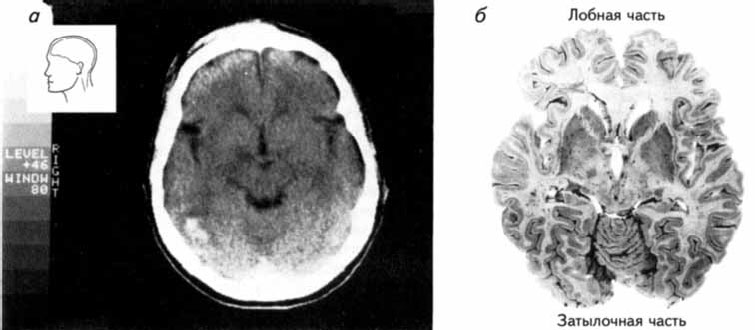 (а) Снимок, полученный на компьютерном томографе; (б) Фотография среза мозга на том же уровне, что и на снимке, приведенном на рисунке (а) (Carlson, 1992).