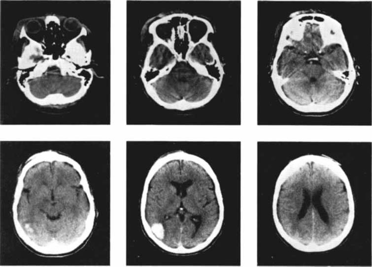Рис. 2.15. Снимки мозга больных, перенесших инсульт на правой половине мозга, полученные с помощью метода компьютерной томографии (Carlson, 1992).
