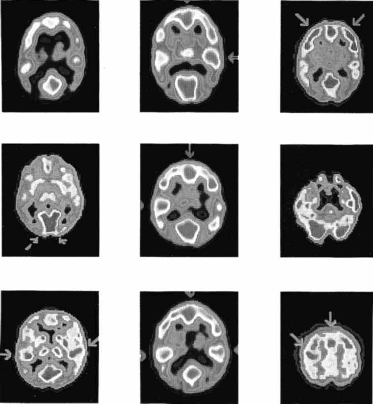 Время полураспада этих веществ составляет от 110 сек для фтора до 120 сек для кислорода. Метаболически активные участки мозга с большей интенсивностью поглощают 2-дезоксиглюкозу из крови, которая в отличие от обычной глюкозы не включается в метаболические процессы и только накапливается в мозге. Радиоактивные изотопы излучают позитроны, которые, встречая в мозге электроны, уничтожаются (аннигилируют), излучая 2 гамма-луча, направляющиеся в противоположные стороны. В специальной камере монтируются детекторы гамма-лучей, собранные в кольца. В камеру помещается голова испытуемого, радиоактивные молекулы 2-дезоксиглюкозы фиксируются сканером (Plum e. a., 1976) (рис. 2.16). Полученные данные обрабатываются компьютером, и на основе результатов воссоздается картина метаболически активных участков мозга.