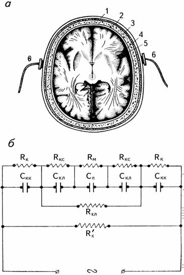 1 – кожа, 2 – мягкие ткани головы, 3 – кости черепа, 4 – пространства, заполненные ликвором, 5 – ткань мозга, 6 – электроды: Rк и Cк – активное и емкостное сопротивления рогового слоя кожи, Rкс и Cкс – то же для костей, Rм – сопротивление мягких тканей, окружающих череп, R к – поверхностное сопротивление кожи (Москаленко, 1977).