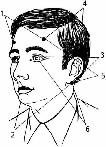 1 – бифронтальное, 2 – бимастоидальное, 3 – окулоокципитальное, 4 – фронтоокципитальное, 5 – фронтомастоидальное, 6 – окуломастоидальное отведения (Москаленко, 1977).
