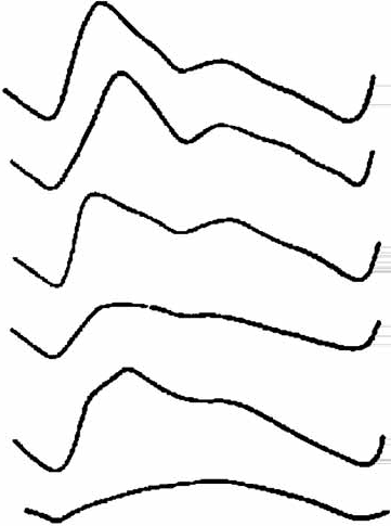 Рис. 2.20. Схематическое изображение изменений кривой РЭГ. Сверху вниз: норма, окклюзия сосуда, артериовенозный шунт, компрессия мозга, начальная и далеко зашедшая форма атеросклероза сосудов мозга (Москаленко, 1977).