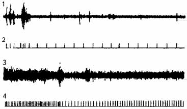 Рис. 2.21. Примеры электромиограмм. 1 и 3 «необработанная» ЭМГ; 2 и 4 – интегрированная ЭМГ (Хэссет, 1981).