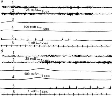 Рис. 2. 24. Изменение физиологических функций испытуемого при наступлении дремоты (а) и при пробуждении (б).