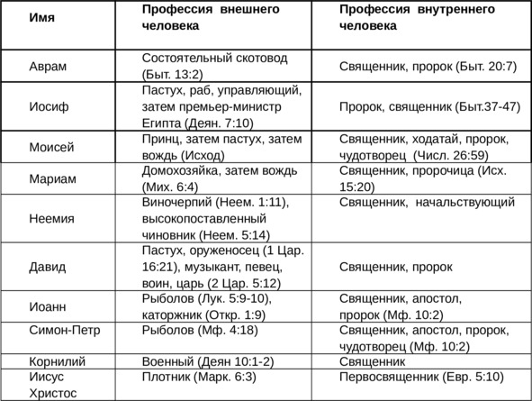 В заключение этого раздела мы составили таблицу, в которой указали «внешние» и «внутренние» профессии знакомых нам всем библейских персонажей, служащих образцом для нас: