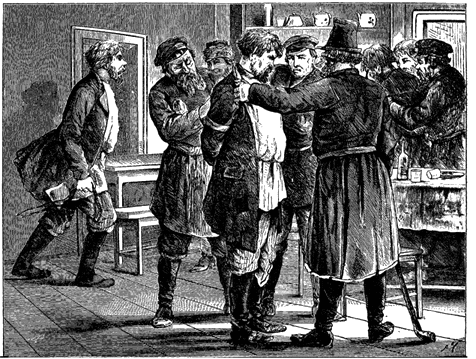 Мужички стояли, почёсывая затылки, и как-то нерешительно изъявляли свою готовность переступить порог трактира. Сотские, видя их замешательство, выступили вперёд, перекрестились и вошли в сени; за ними двинулись и крестьяне.