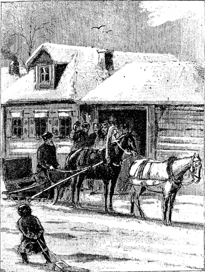 Урядник уложил в сани портфель и шкатулку его благородия: тот уселся в сани, кавалер поместился с кучером на облучке. Лошадей вывели со двора на улицу.