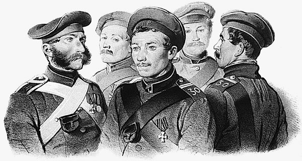 В. Ф. Тимм. Герои обороны Севастополя (слева направо): А. Елисеев, А. Рыбаков, П. Кошка, И. Дымченко, Ф. Заика. Иллюстрация из «Русского художественного листка». 1855 г.
