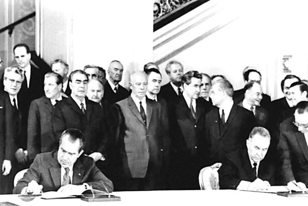 Илл. 1. 24 мая 1972 г., Москва. Президент США Р. Никсон (слева) и Председатель Совета Министров СССР А. Н. Косыгин подписывают Соглашение между СССР и США о сотрудничестве в исследовании и использовании космического пространства в мирных целях. За спиной президента США стоит Генеральный секретарь ЦК КПСС Л. И. Брежнев
