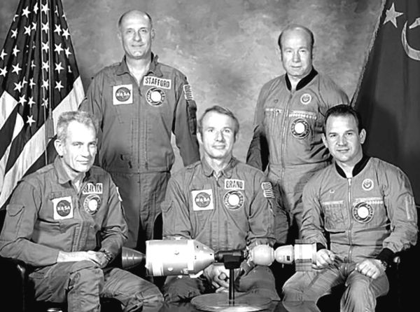 Илл. 2. Экипажи «Аполлона» (Д. Слейтон, Т. Стаффорд, В. Брандт) и «Союза-19» (А. Леонов и В. Кубасов)