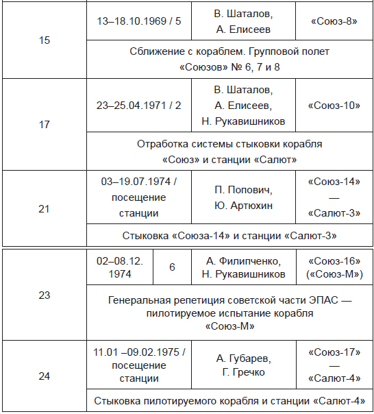 За этим исключением, в выборку включены лишь те полеты, в которых отрабатывались элементы сближения космических кораблей (и станций) и их стыковки. Потому что именно сближение и стыковка «Союза-19» и «Аполлона» были «гвоздем» официального проекта ЭПАС. В таблицу также не включены трагически закончившиеся полеты на «Союзе-1» и «Союзе-11».