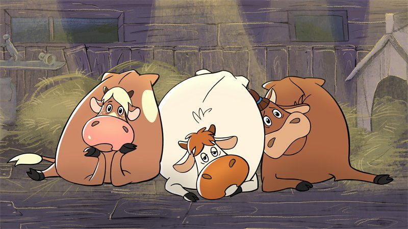 К вечеру и ливень на улице закончился. Довольные коровы спали в загоне. А Матроскин ставил на тележку последнюю коробку с молоком.