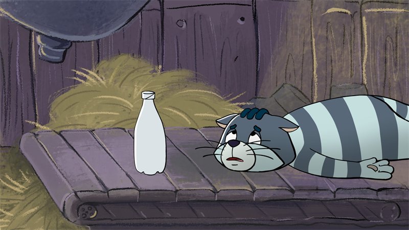 Матроскин взял бутылку с конвейера. Из нее упала единственная капля молока.