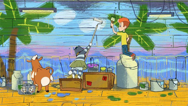 Друзья взяли краски поярче и стали коровник в курорт превращать. Вера Павловна и Тама-Тама на стенах море и рыб нарисовали. Матроскин и Дядя Фёдор – пальмы с кокосами. А Шарик валиком на полу песок изобразил.