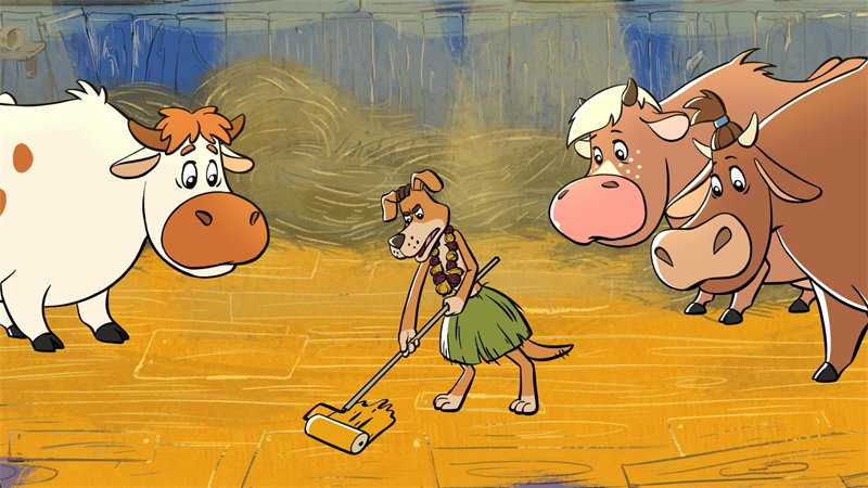 В этот момент в коровник влетел перепачканный краской Галчонок. Яркой птичкой коровы сразу заинтересовались. Гаврюша даже встал… и нечаянно опрокинул тележку, где Шарик вздыхал. Пёс кубарем покатился в стог сена. Солома повисла на нём, точно юбка. Шарик вскочил, попятился и тут – бах! – не замеченные им в траве грабли ударили его по голове. Он схватился за палку и зашипел от боли. В травяной юбке и с граблями-копьём в лапах Шарик был очень похож на дикаря. Вокруг него летал Галчонок. Разноцветный, как попугай.