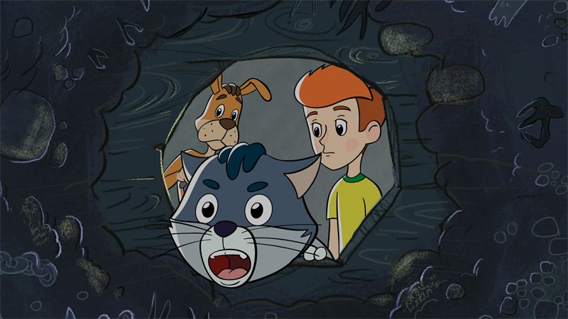 Друзья решили проверить тайный ход. Первым полез Дядя Фёдор, за ним Шарик с ошейником в зубах, а Матроскин не пролез, потому что застрял.