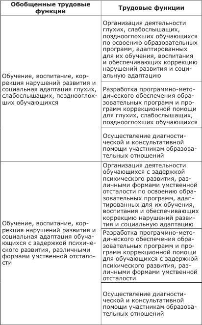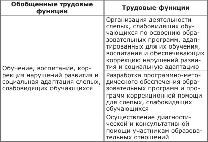 Для реализации трудовой функции «Организация деятельности обучающихся с ограниченными возможностями здоровья по освоению образовательных программ, адаптированных для их обучения, воспитания и обеспечивающих коррекцию нарушений развития и социальную адаптацию» к обобщенным трудовым действиям, умениям и знаниям педагога-дефектолога можно отнести: