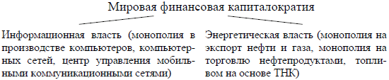 Экономика США в настоящее время потребляет 60 % минерального нетопливного сырья, 58 % нефти и около 50 % природного газа (от общего объема мировой добычи) при доле собственной добычи около 20 % от потребности (М. Диченко, 1999, с. 50). Известно высказывание президента Трумена, сделанное им 11 сентября 1953 года, о том, что американская нефтяная деятельность является в практическом плане инструментом внешней политики США. Это высказывание подтверждает наше положение: мировая финансовая капиталократия захватывает в свои руки энергетическую и информационную власть. Представим это в виде схемы: