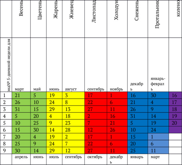 Таблица соответствия числа месяца 12 месячного календаря с началом недели 8-ми полусезонного календаря (пятидневная неделя).