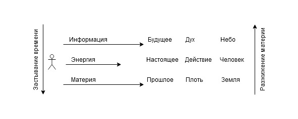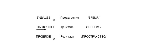 Существует сразу три времени (синхроническая связь): прошлое, настоящее и будущее – они одномоментны. Прошлое – это низ. Будущее – верх. Настоящее – середина. Три времени параллельны.
