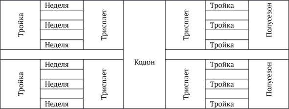 Тройка – это три недели, пятнадцать дней. Планирование деятельности может осуществляться в поточном режиме, когда, вместо ограничивающих клеток для каждого дня, есть недельная полоса. В разрывах указывается день полусезона (сверху или снизу – по удобству)