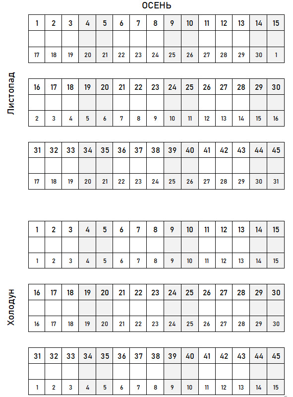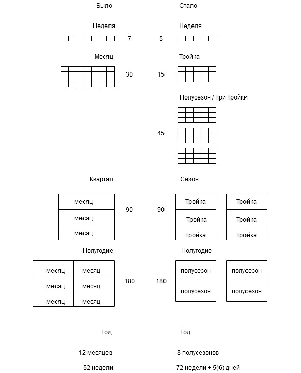 Пять дней в неделе. Восемь полусезонов в году. Мы ускорили неделю и замедлили «месяц». Образовавшийся разрыв соединяем Тройкой – тремя неделями (15 дней).