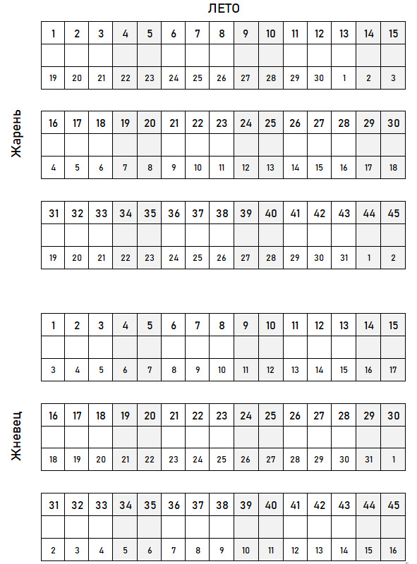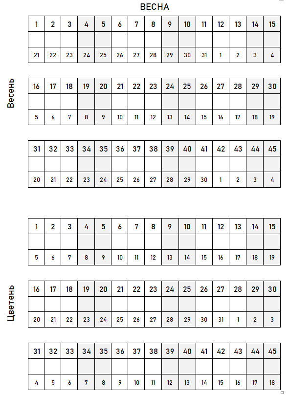 Выделены недели. По три в каждой Тройке. Одна неделя – одна карта Ората. Для каждого дня колена своя карта возделывания.