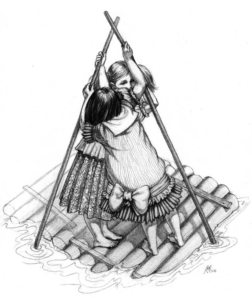 Бросила свою корзинку и пустилась бегом. Только пятки голые засверкали… Девочки поняли, что она побежала за помощью. Стоят горе-мореплаватели, держатся за шесты да друг за друга. Только бы не упасть.