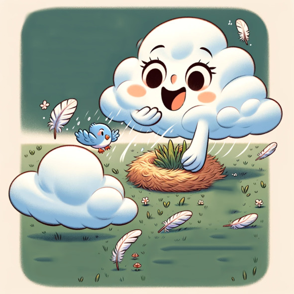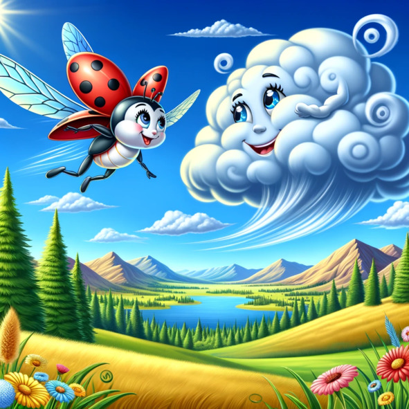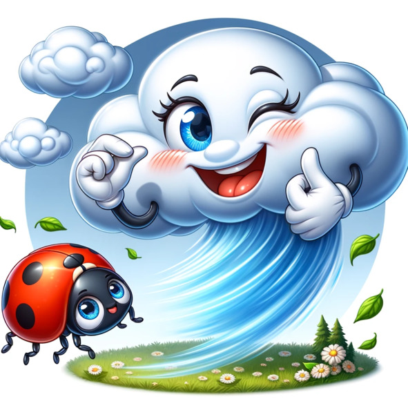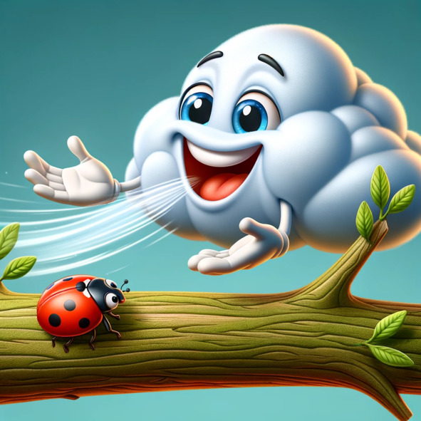 Новый Ветерок вскричал радостно: «Я могу двигать воздух! Я тебе помогу высушить крылья быстрее!» И он быстро пролетел рядом с Божьей Коровкой. Воздух завихрился вокруг нее, поднял и закружил, унося ее с ветки дерева. Новый Ветерок подхватил Божью Коровку, не давая ей в падении стукаться о ветви дерева, и бережно опустил на землю.