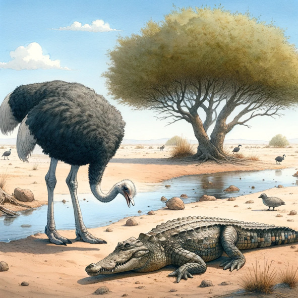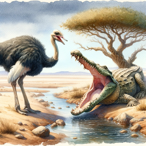 Рассказал страус всю историю своего путешествия: от родной пустыни до здешнего леса. Потом спросил: «Водятся у вас тут крокодилы?»