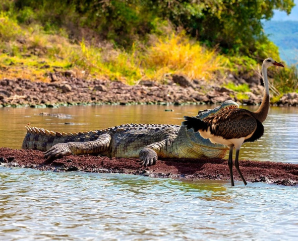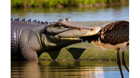 Но крокодил уворачивается, хвостом по земле бьет, к воде страуса тянет.