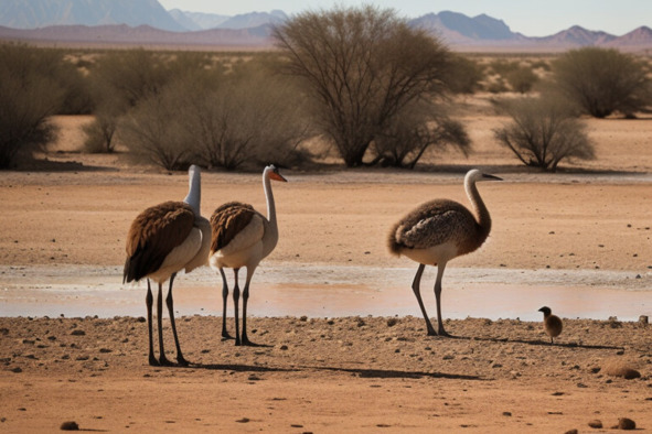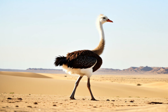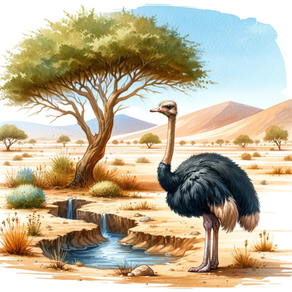 Любопытно стало страусу: что такое неизвестное на обычно пустом песке лежит.