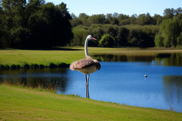 Страус, опасаясь, попил, стоя на самом мелководье: не полез больше в воду в незнакомом месте и не стал трогать прибрежные предметы и растения.