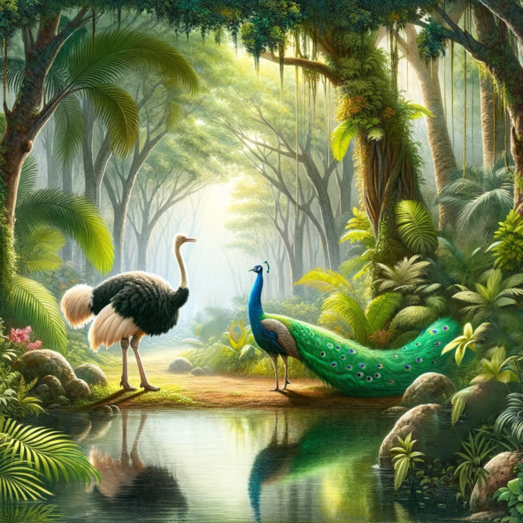 Одна из птиц подошла поближе к страусу и спросила: «Ты кто?»