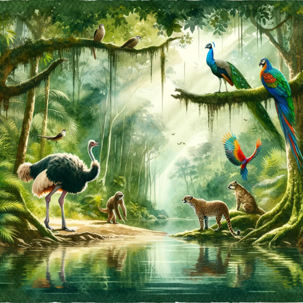 – Я – павлин, он – антилопа бонго, а на деревьях – обезьяны. В лесу живет множество других птиц.
