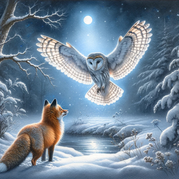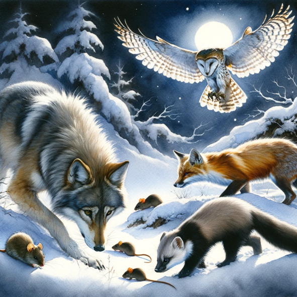 Лисица низом бежит, Сова верхом летит, Волк кругами вокруг бегает, Куница по деревьям с ветки на ветку перескакивает.
