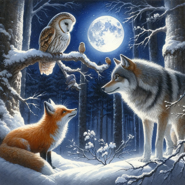 Бредут они дальше: Сова с воздуха высматривает, Куница по деревьям рыщет, Лиса и Волк на земле вынюхивают.