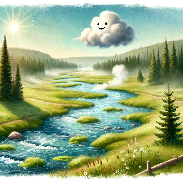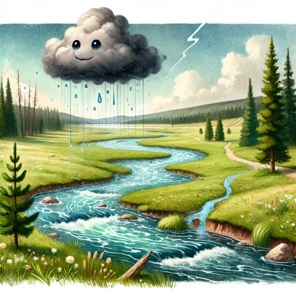 По дороге она вбирала воду из других родничков и становилась всё шире и глубже. Когда солнце нагревало все вокруг, то с ее поверхности вспархивали облачка. Они улетали в небо. Их подхватывал ветер и уносил далеко-далеко, где они проливались дождем. Дождь пропитывал земли, собирался в подводные реки, которые затем родничками выходили наружу, давая начало новым ручьям.