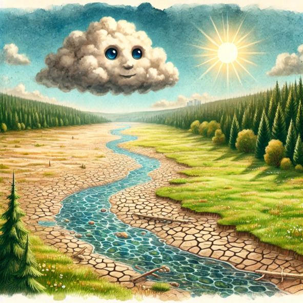 Но вот однажды Облачко заметило, что речка стала мелеть. Оно поднялось повыше и вдалеке тоже увидело, что русло реки будто сжалось, превратившись в узкую ленту.