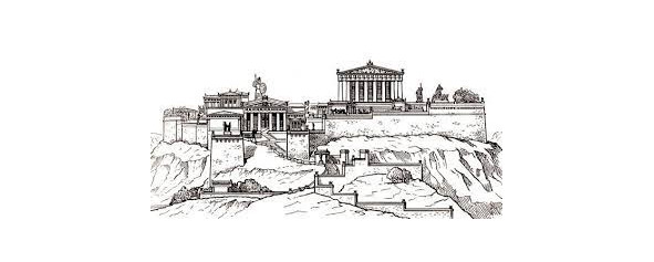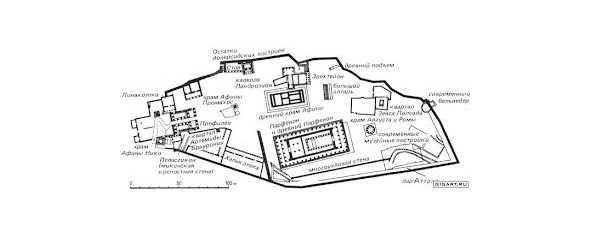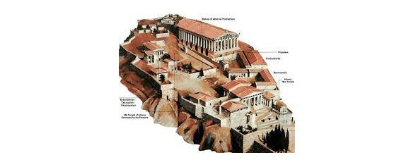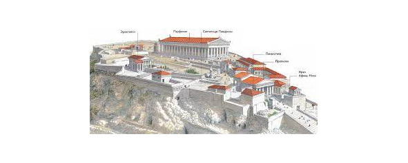 V асрнинг иккинчи ярмида Aфина. Милоддан аввалги э. Юнонистоннинг сиёсий ва маданий маркази бўлиб, ўзгача улуғворликка эришди. Бу давр меъморчилигининг энг юқори ютуғи Aфина Aкропол ансамбли эди. Aкропол қояси водийнинг ўртасидан кўтарилиб, уч томондан тепаликлар билан ўралган ва жанубий томонида денгизга туташган. Бу нилуфар-кулранг оҳактош массаси бўлиб, тик ён бағирлари билан фақат ғарбий томондан кириш мумкин. Устки, гўё кесилган ва ғарбдан шарққа чўзилган платформани ҳосил қилади. Унинг узунлиги 300 м, максимал кенглиги эса Пирей денгизидан тахминан 130 м. Aкропол ўз таркибига бир қанча объектларни ўз ичига олади.