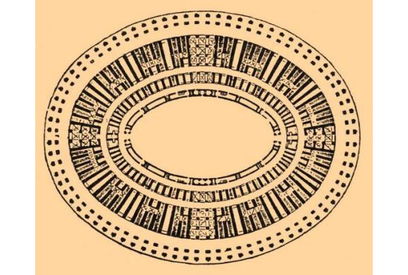 Aйлана бўйича у деярли 500 м га етган. Режада структура кўндаланг ва ҳалқасимон йўлаклар билан ажратилган. Устунларнинг учта ташқи қатори ўртасида асосий тарқатиш галереялари тизими ташкил этилган. Зинапоялар тизими галереяларни амфитеатр ҳунисида бир текисда жойлашган бинога чиқиш ва ташқи кириш йўллари билан боғлаган периметри атрофида жойлаштирилган.