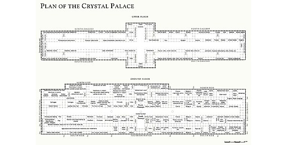 Кристал саройнинг бирон бир меъморий элементи ҳақиқатан ҳам монументал эмас эди; саройнинг ўзи соф миқдорий маънода монументалдир. У 72 минг м2 дан бир оз камроқ майдонни эгаллаган. Режада тўртбурчаклар бўлган бино оддий геометрик шаклларнинг синтези эди.